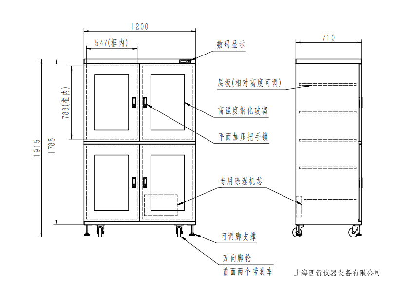 3.防潮箱門玻璃區域選用3.0mm鋼化玻璃,防前傾耳式結構設計。帶平面加壓把手鎖*體化設計,有防盜功能。D部安裝可移動帶剎車腳輪方便移動及固定(防靜電機型腳輪為防靜電)。