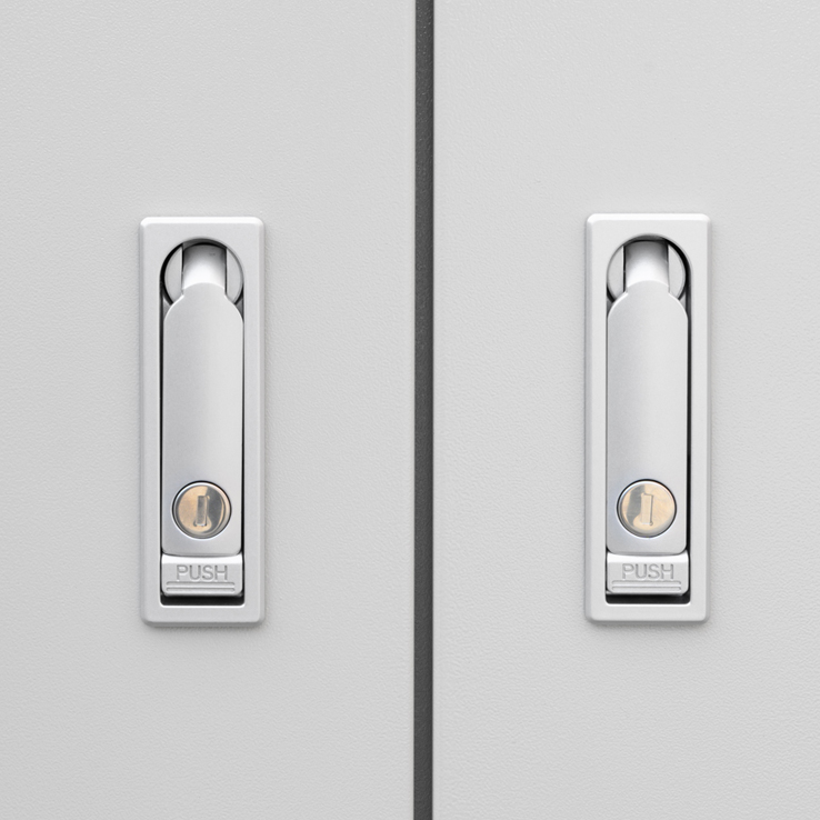 3.防潮箱門玻璃區域選用3.0mm鋼化玻璃,防前傾耳式結構設計。帶平面加壓把手鎖*體化設計,有防盜功能。D部安裝可移動帶剎車腳輪方便移動及固定(防靜電機型腳輪為防靜電)。