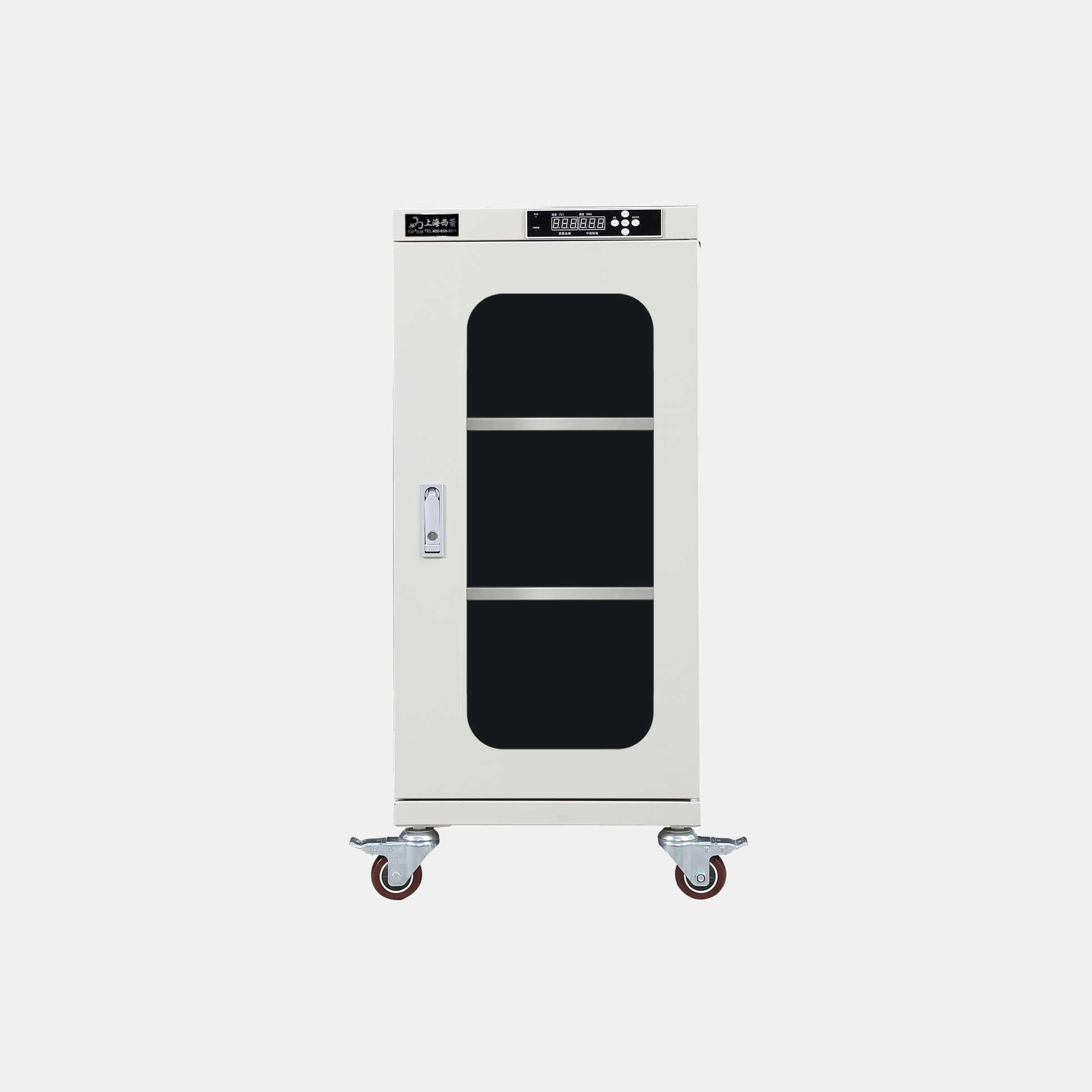 3.防潮箱門玻璃區域選用3.0mm鋼化玻璃,防前傾耳式結構設計。帶平面加壓把手鎖*體化設計,有防盜功能。D部安裝可移動帶剎車腳輪方便移動及固定(防靜電機型腳輪為防靜電)。