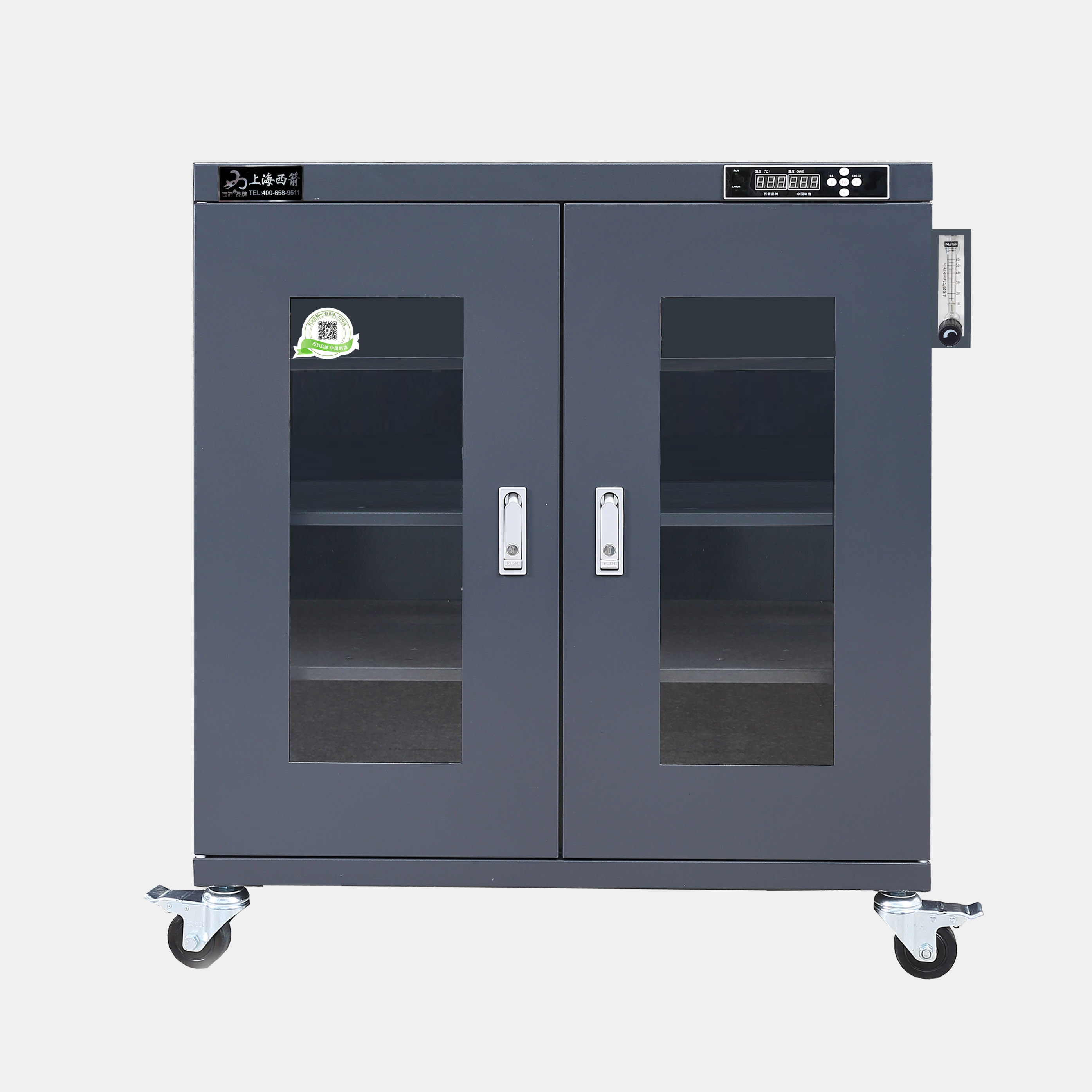 10.配置水晶防爆流量計,電磁閥為日本SMC品牌,濕度1~60%RH可設定,濕度到達設定值時,系統自動切斷氮氣,反之自動打開氮氣并采用氮氣分流設計,確保箱內氮氣分布均勻。